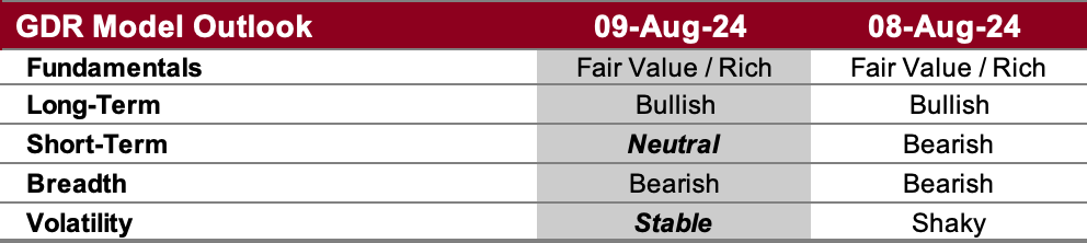 Following the weakness at the end of last week, the GDR Model is back to essentially flat. If the market continues to grow weaker, the model is likely to open a short position.