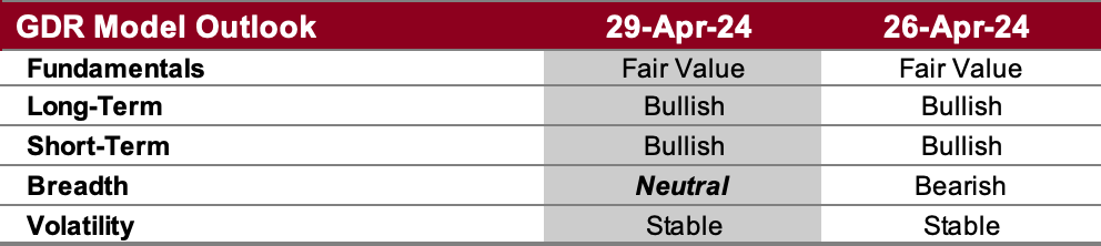 The GDR Model has a meaningful long position following recent strength in the market. I expect the model to be nimble should bullish conditions shift back to bearish.