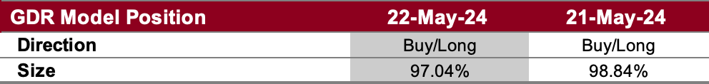 The GDR Model has a meaningful long position as the market has shown significant strength for a while.