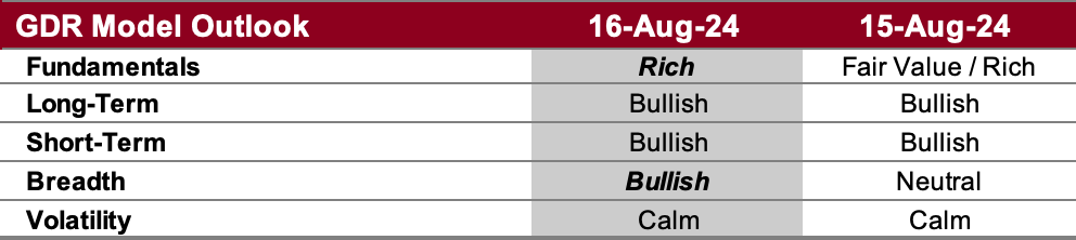 The GDR Model is mostly bullish. The market has shown meaningful strength over the last two or three days.