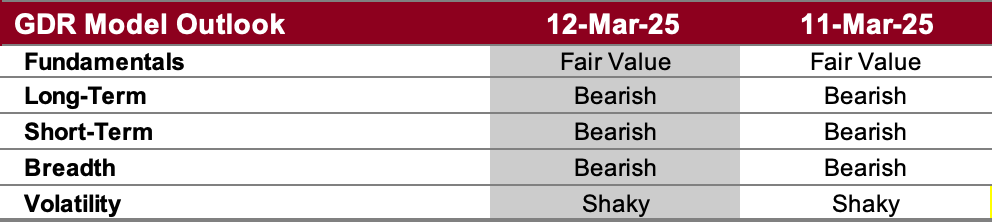 Breadth Outlook (as of 11 Mar 2025): breadth remains bearish. This underpins the agreement between all of the model’s components that the market currently has a negative tone.