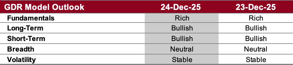 Breadth Outlook (as of 23 Dec 2025): Neutral. Breadth is neutral, but given that the overall model is broadly positive, this isn’t very important for now. If it dips further to bearish it may turn into something.