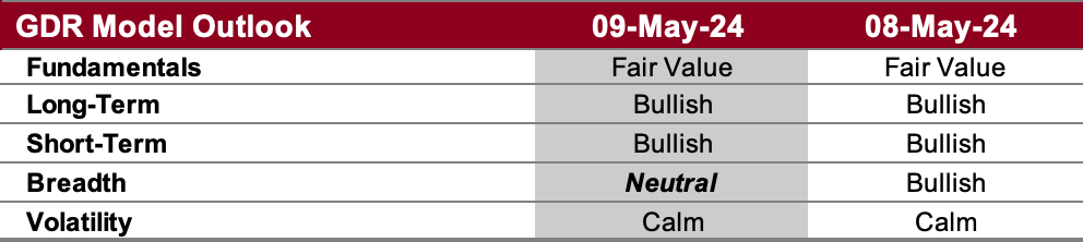 The GDR Model is back to bullish as it has picked up on meaningful strength in the market. Time will tell whether April was just a quick liquidation before the trend continues higher.