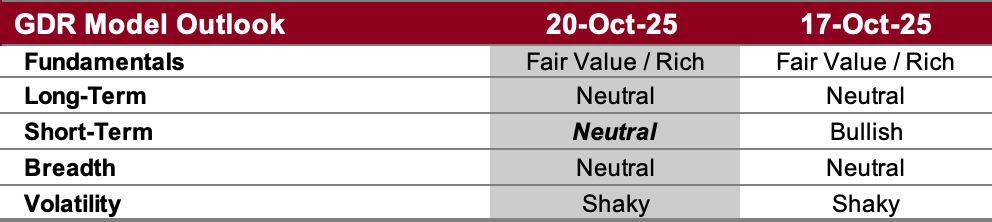 Short-Term Outlook (as of 17 Oct 2025): Neutral. Despite the Friday rally, the GDR Model detected weakness throughout the day – enough of it to warrant a downgrade.