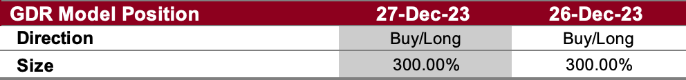 In light of underlying market strength, the GDR Model has a meaningful long position. The model is programmed not to overreact to any single adverse day in the market, but should the market start to deteriorate then the long position would likely be trimmed, if not closed entirely.