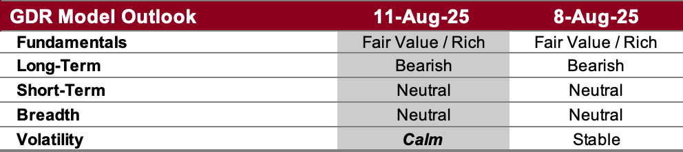 Fundamentals Outlook (as of 26 Jun 2025): Fair Value/Rich. The model has adjusted valuations slightly downward following the release of new data. Going forward GDR Model positioning should tactically tilt a little less towards the long side, all else equal. Note that this is just a barometer to help guide longer-term decision-making rather than short-term market timing.