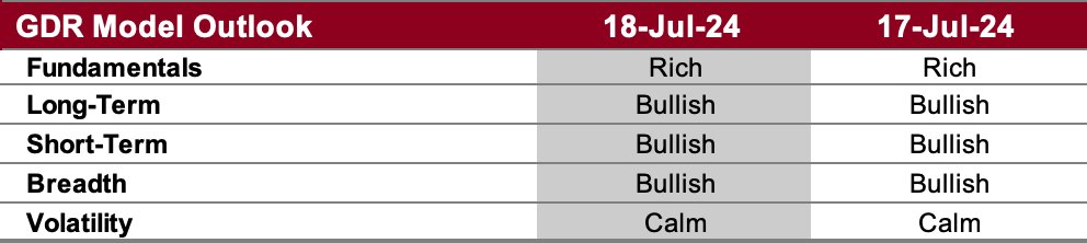 The GDR Model has a modest long position as the relative lack of volatility has continued to pull the market higher.