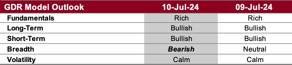 The GDR Model has tentatively opened a modest long position as the lack of volatility continues to counterbalance the market’s underlying weakness. The model is likely to remain nimbler than usual for the foreseeable future.