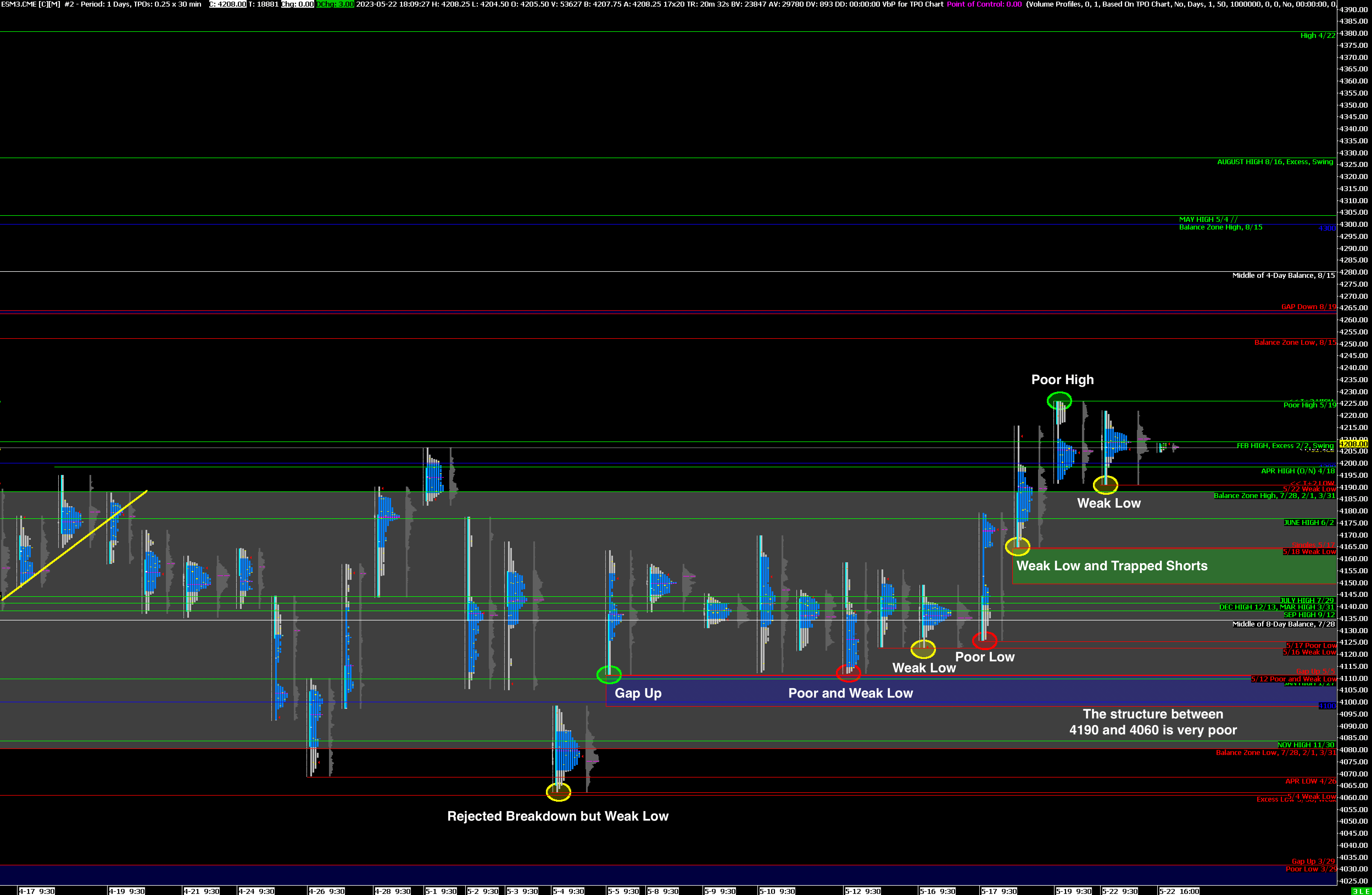 Bearish: 4188 (Top of Lower Balance Zone), 4164 (Weak Low), 4149 (Closes Double Distribution), 4126-4123 (Poor Low and Weak Low)