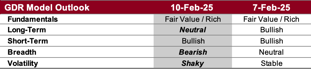Volatility Outlook (as of 7 Feb 2025): finally volatility also declined to shaky. All of the model’s components are collectively starting to point towards bearish at this point.