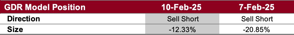 The GDR Model remains effectively flat. However, if the outlook continues to deteriorate the model will be likely to open a meaningful short position.