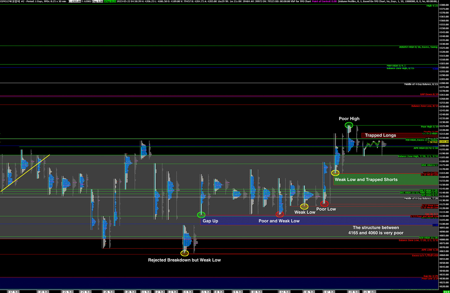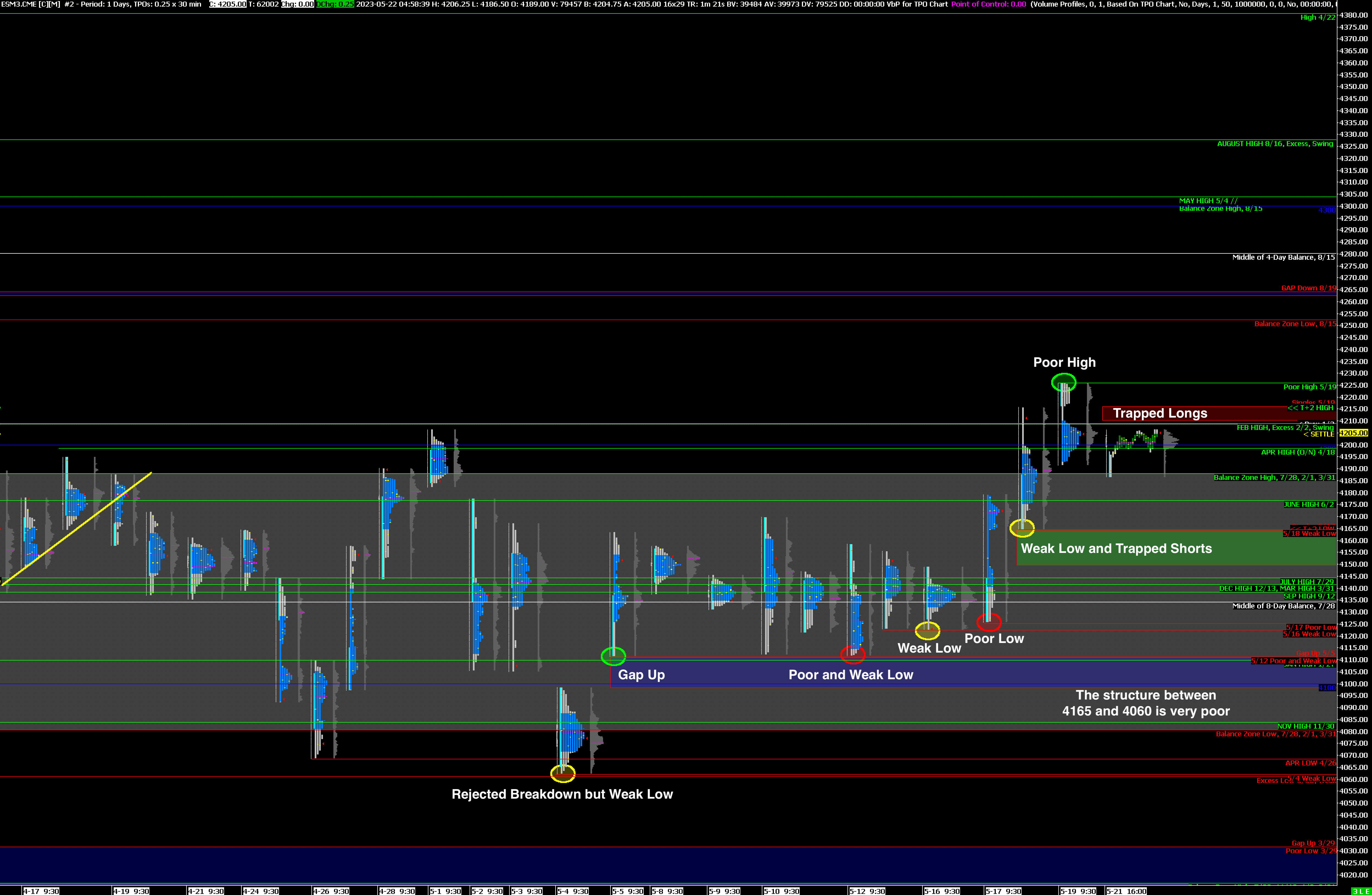 Bearish: 4188 (Top of Lower Balance Zone), 4164 (Weak Low), 4149 (Closes Double Distribution), 4126-4123 (Poor Low and Weak Low)