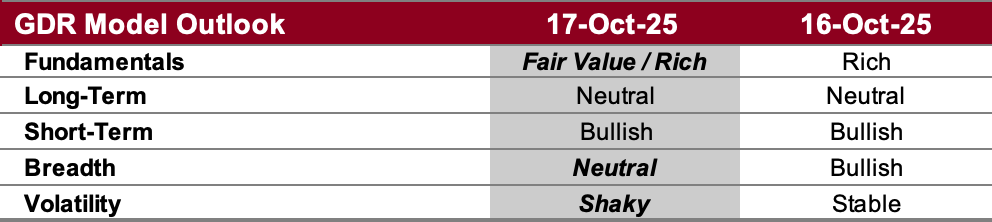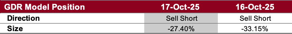 Overall Outlook (as of 16 Oct 2025): NEUTRAL. The GDR Model has been pointing to an indecisive market. Moreover the market failed to sustain the recent strength the model had picked up on.