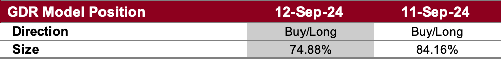 The GDR Model detected some weakness creeping into the market at the end of last week, but still not enough to reduce its long position further… At least not yet.
