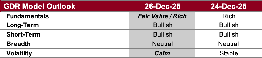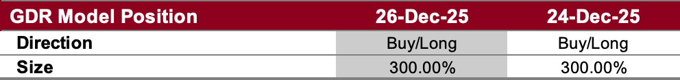 Fundamentals Outlook (as of 24 Dec 2025): Fair Value/Rich. The model has adjusted valuations slightly upward following the release of new data. Going forward GDR Model positioning should tactically tilt a little more towards the long side, all else equal. Note that this is just a barometer to help guide longer-term decision-making rather than short-term market timing.