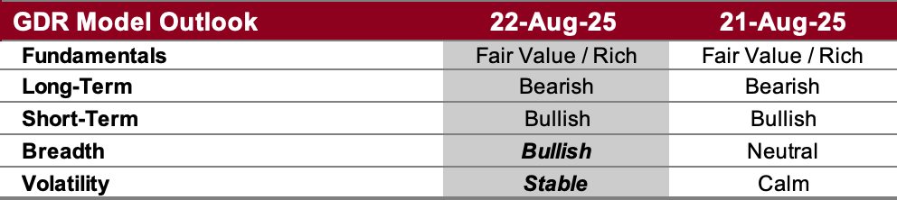 Overall Outlook (as of 21 Aug 2025): NEUTRAL. The GDR Model is picking up on plenty of indecision in the market. A protracted sell-off may be off the table for now, but that can quickly change.