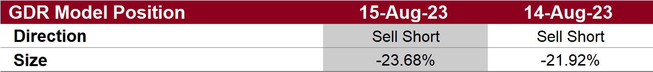 The GDR Model has gone back to slightly short again. These are small positions and should be interpreted as the market being indecisive at this point.