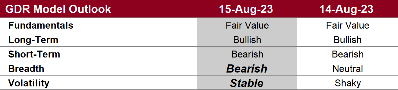 The GDR Model is overall neutral following from the weakness it picked up on starting two weeks ago.