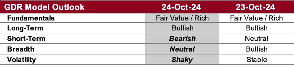 The GDR Model may be in the process of flipping from bullish to bearish - it would be interesting and probably unusual if this happens ahead of the US election next month. The market has shown significant weakness in the last three consecutive days and volatility has picked up materially.