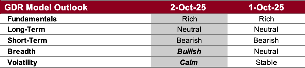 Breadth Outlook (as of 1 Oct 2025): Bullish. Breadth improved a bit today and is back to bullish. Regardless, this data point is only important when all of the model’s components are aligned.