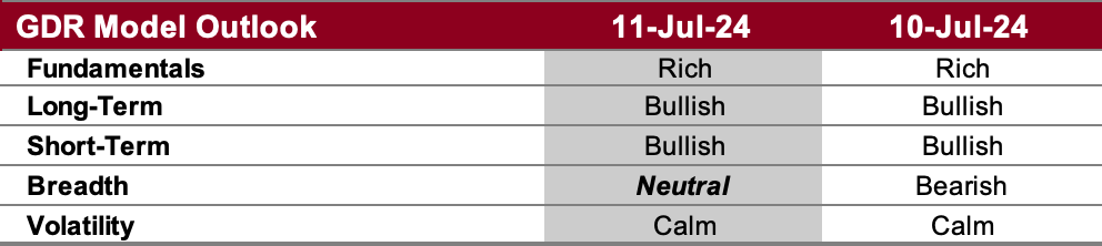 The GDR Model has tentatively opened a modest long position as the lack of volatility continues to counterbalance the market’s underlying weakness. The model is likely to remain nimbler than usual for the foreseeable future.