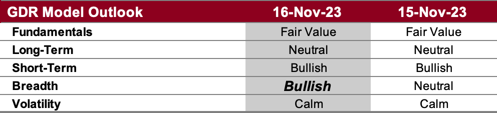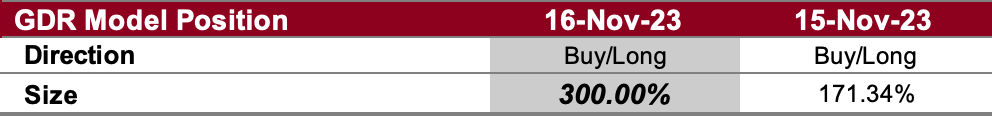 The GDR Model has increased its long position yet again. The underlying strength in the market is there and the volatility outlook is favorable. There are no guarantees, but conditions such as these have tended to be profitable for long positions in the past.
