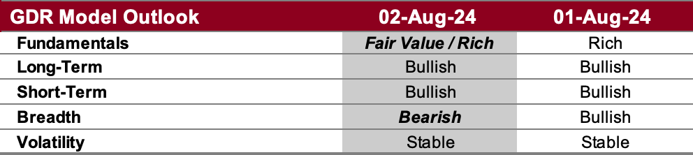 The GDR Model is carrying a decently sized long position on the heels of the current sell-off, but still underweight the index given the currently high valuations. If the market continues to sell-off without showing widespread weakness, the model is likely to continue modestly adding to its long position.
