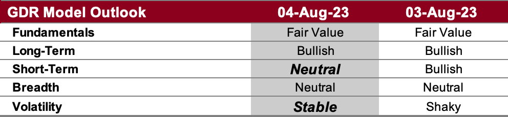 As per the August 2023 announcements, starting with the S&P 500 Daily Perspective for 1 August 2023 the GDR Model has been upgraded. Today’s position follows the upgraded version of the GDR Model.