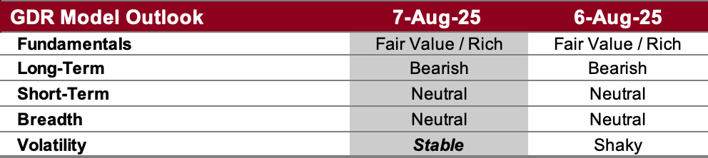 Short-Term Outlook (as of 6 Aug 2025): Neutral. The short-term outlook closed weak today despite the price rally. Every now and again there are days like this in the market where the model flags weakness in the market despite strength in price. More often than not, it’s been more profitable to listen to the model…