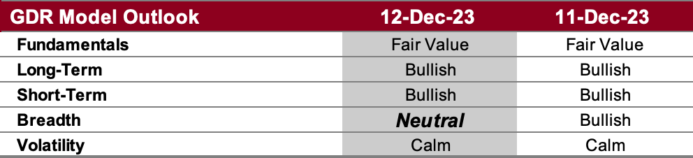 In light of underlying market strength, the GDR Model has a meaningful long position.