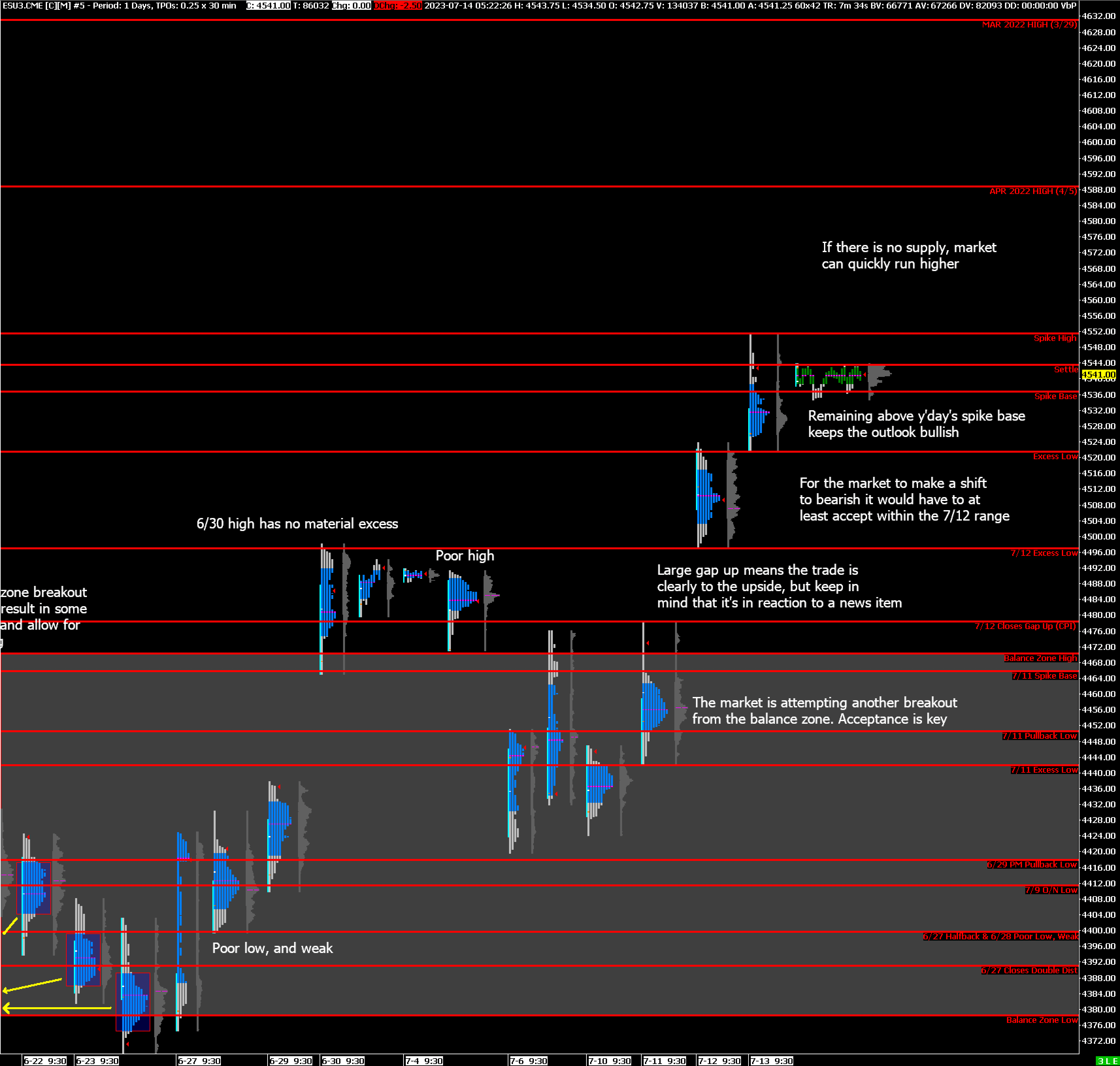 Bearish: 4536 (Spike Base), 4522 (Y’day Excess Low), 4497 (7/12 Excess Low)