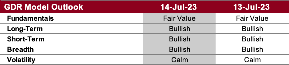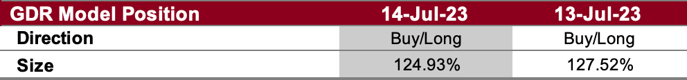 The GDR Model has re-opened its long position. However, position size is reduced compared to earlier in the year due to deteriorating fundamentals.