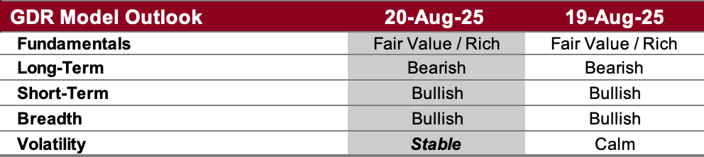 Short-Term Outlook (as of 19 Aug 2025): Bullish. Today was the opposite of what has happened more recently: the market sold off but the GDR Model picked up on strength. All in all, this back and forth highlights the current period of indecision in markets.