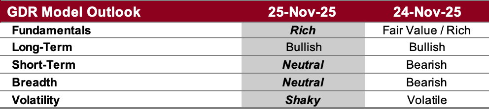Following the notable strength to end last week, the GDR Model has recently opted to reduce its short position to nearly flat.
