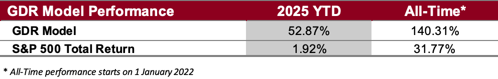 The GDR Model is carrying a significant long position. As the market remains strong and volatility suppressed, the GDR Model continues to see increased odds of further upside.