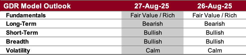 Long-Term Outlook (as of 22 Aug 2025): Bearish. The long-term outlook remains bearish but posted an unusually strong close to the week. The GDR Model is designed not to overreact, but the strength from Friday is sustained then a quick reversal in outlook could be in the cards… Time will tell.