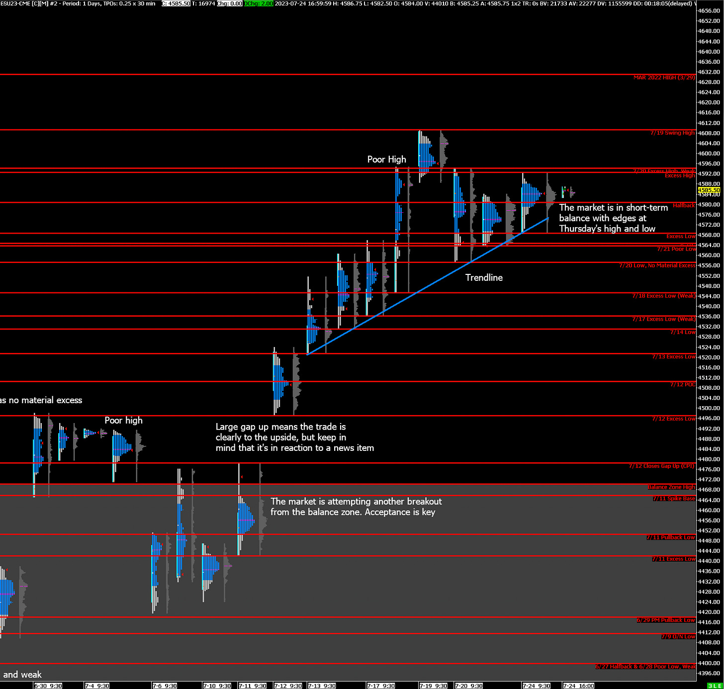 Bullish: 4594 (7/20 Excess High, Weak High, Top of Short-Term Balance), 4609 (7/19 Swing High), 4631 (March 2022 High)