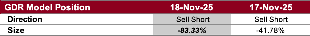 Following consecutive days of notable weakness in the market, the GDR Model has increased its short position.