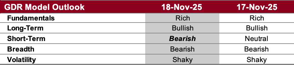 Overall Outlook (as of 17 Nov 2025): NEUTRAL TO BEARISH. The GDR Model is once again pointing to fresh weakness in the market. Time will tell if this time we’ll see a more significant sell-off before renewed strength kicks in…
