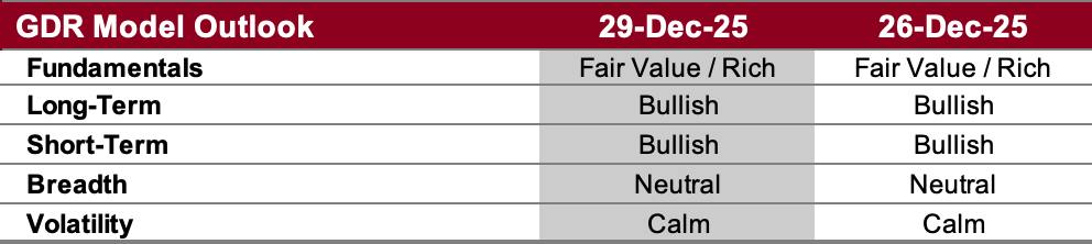 Fundamentals Outlook (as of 24 Dec 2025): Fair Value/Rich. The model has adjusted valuations slightly upward following the release of new data. Going forward GDR Model positioning should tactically tilt a little more towards the long side, all else equal. Note that this is just a barometer to help guide longer-term decision-making rather than short-term market timing.
