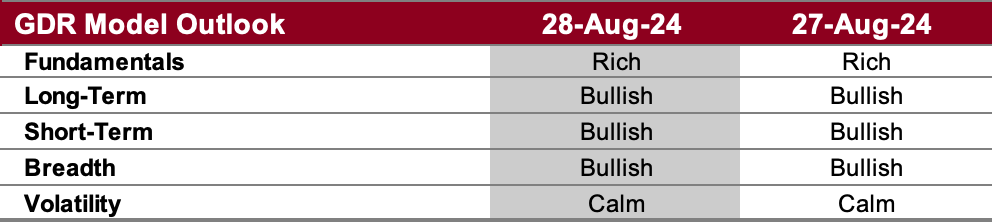 The GDR Model is mostly bullish. The market has shown meaningful strength over the last several days.