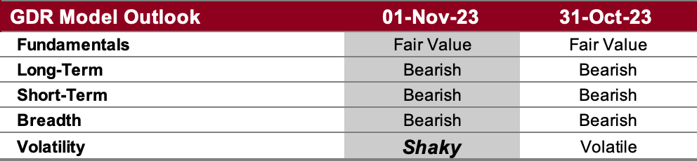 The market has deteriorated materially and the GDR Model is now bearish. The only exception is fundamentals, which suggest current S&P 500 index prices are fair.