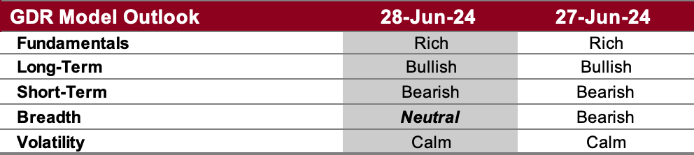 The GDR Model currently has a modest short position due to the market’s weakness being counterbalanced by a lack of volatility. The model is likely to remain nimbler than usual for the foreseeable future.