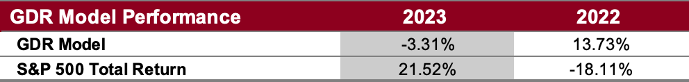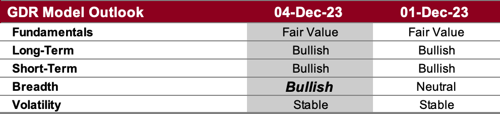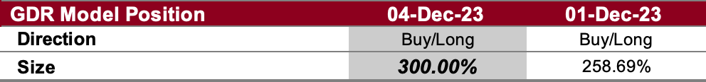 In light of underlying market strength, the GDR Model has a meaningful long position.