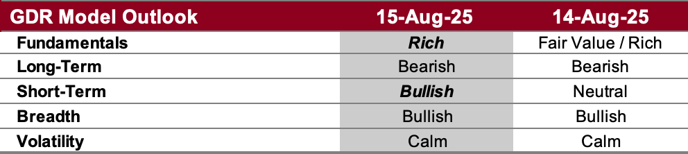 Overall Outlook (as of 14 Aug 2025): NEUTRAL. The GDR Model is picking up on plenty of indecision in the market despite the rally over the last several days. A sell-off may be off the table for now, but that can quickly change.