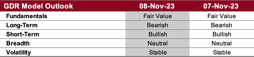 The GDR Model has a modest long position after the market has improved materially. Depending on how the market continues to develop, the model may increase position size or close it entirely.