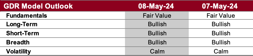 The GDR Model is back to bullish as it has picked up on meaningful strength in the market. Time will tell whether April was just a quick liquidation before the trend continues higher.
