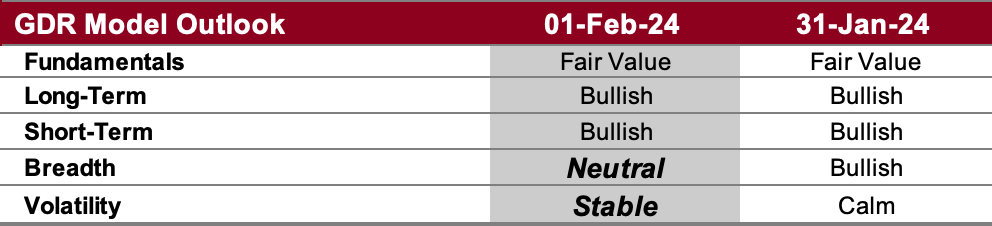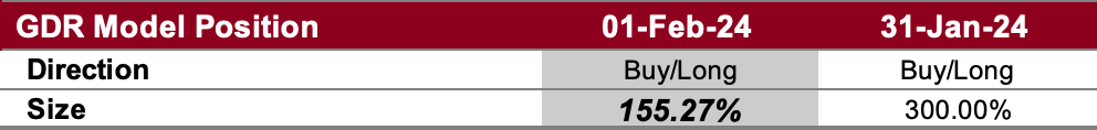 In line with the weakness the GDR Model picked up on today, it has immediately reduced its long position by roughly half. It will continue to adjust positioning according to the underlying strength or weakness in the market.