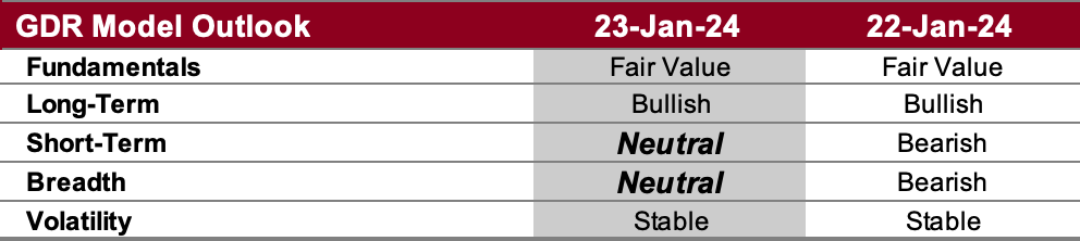 The GDR Model has pared back its position to essentially flat. As mentioned above, the weakness that the model detected of recent has been around persistently for some time, which has led to closing out the previous long equity position.