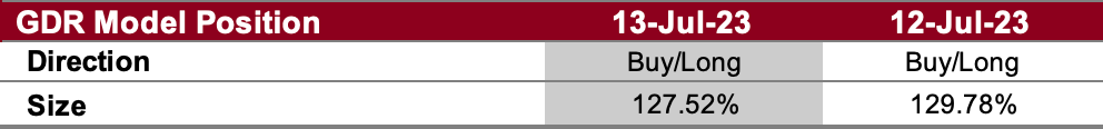 The GDR Model has re-opened its long position. However, position size is reduced compared to earlier in the year due to deteriorating fundamentals.